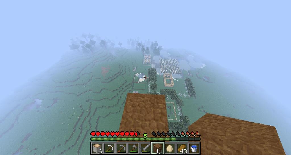 左手前が畑。画面中央が家。家の右側が材料集めるために木を植えた。