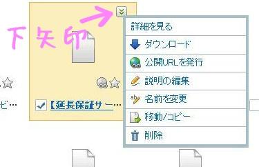 また、下記画像のようにファイルの右上の下矢印をクリックすると、ダウンロード等色々な項目が出てくるので、
