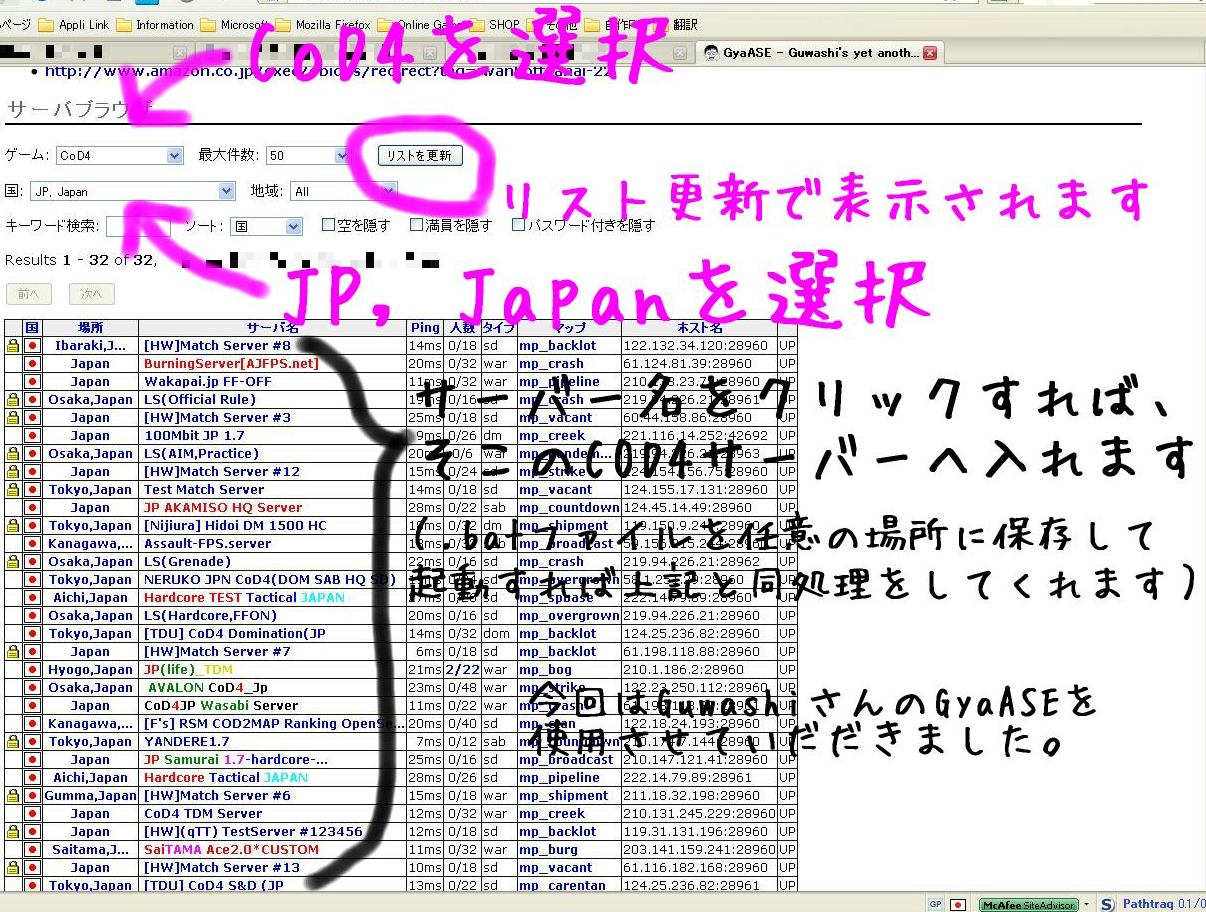 FPS ゲームサーバブラウザGyaASEを使ってのCOD4日本サーバー検索。