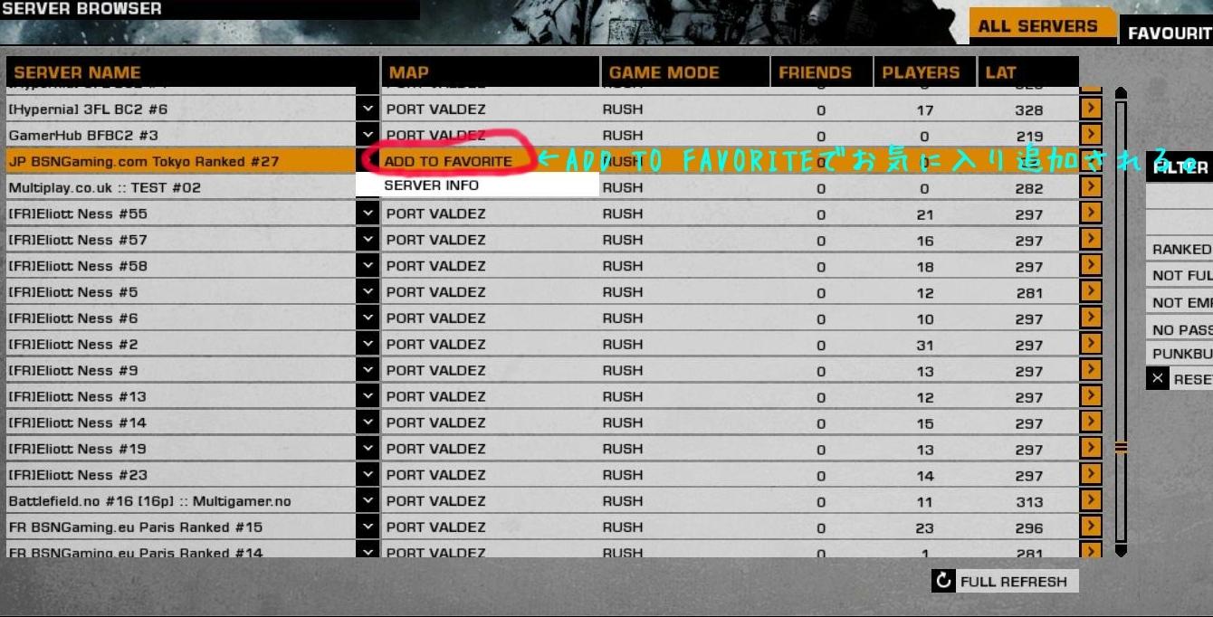 サーバーをお気に入りに追加するやり方は、ゲーム内サーバーブラウザ開いて該当サーバーを探して[ADD TO FAVORITE]押すと[FAVORITE SERVERS]に追加されます。(次から検索がめんどくさいので追加)。